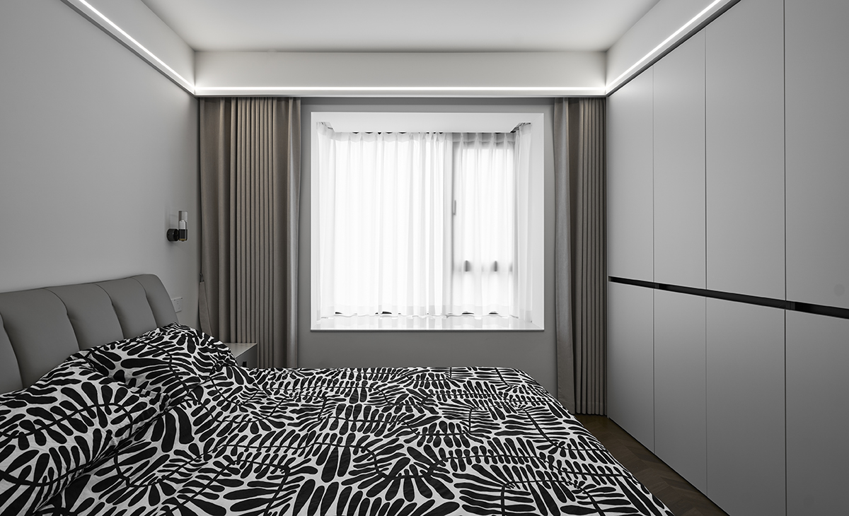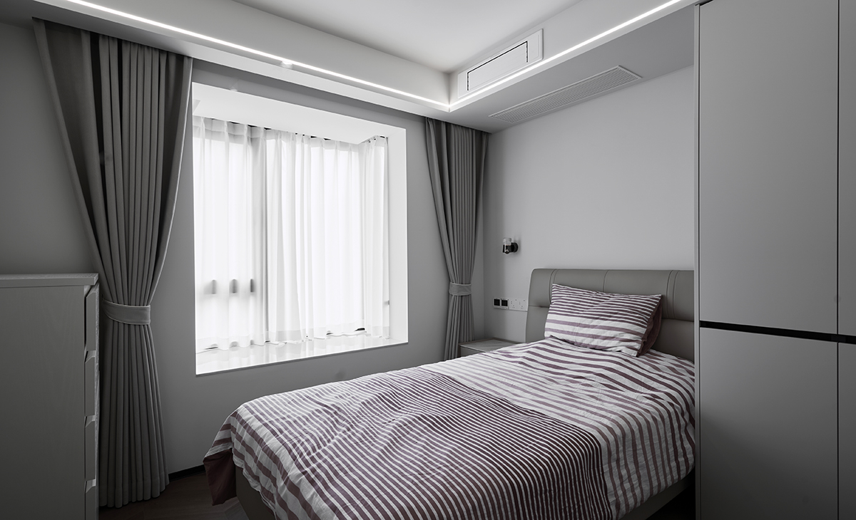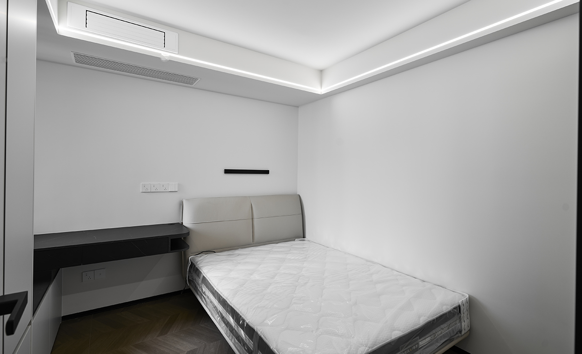 次臥以白色與淺灰色墻布作為主要配色,營造寧靜舒適的氛圍。結(jié)合石膏板做層次立方體,功能簡化為睡眠區(qū)?。