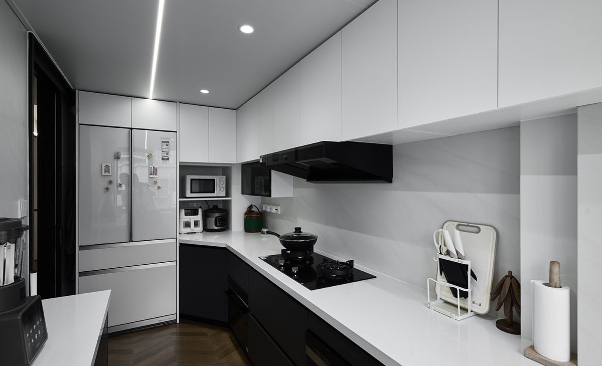 中廚空間以頂置吊軌的方式實(shí)現(xiàn)空間界面的隱形轉(zhuǎn)換,吊軌系統(tǒng)通過預(yù)埋結(jié)構(gòu)與天花板造型整合,地面無門檻石過渡,完整保留空間的純粹狀態(tài)。