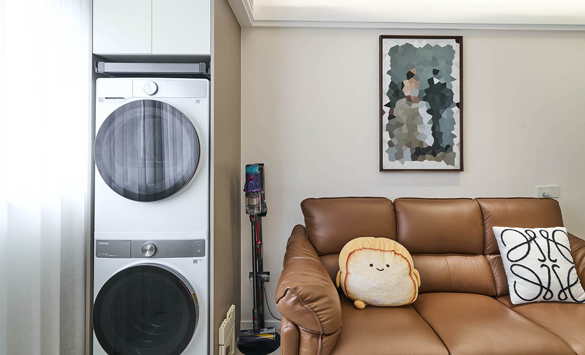 該套房子陽臺的空間利用的很完美,定制洗衣機柜,上面做一個吊柜內嵌掛衣桿,使用起來很方便,把空間襯托的完美無霞。