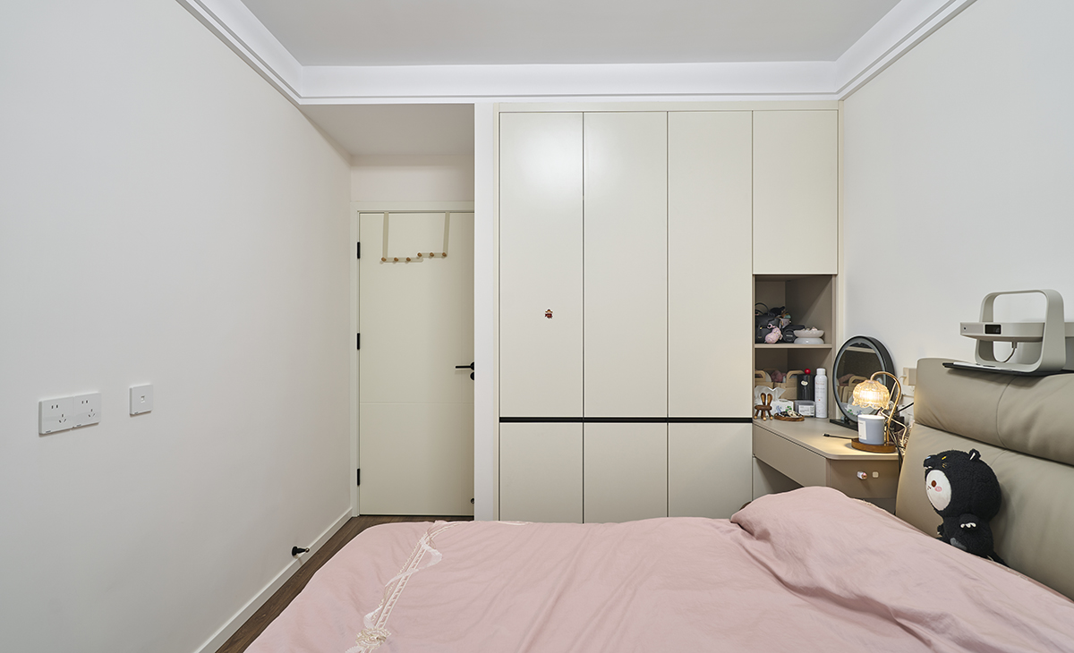 主臥皮質造型床和粉色床品和地板的顏色相呼應,衣柜和顏色也是現代風格的分段式內嵌拉手,頂面懸浮吊頂和雙眼皮結合也不呆板,比較靈活。梳妝臺也是一個亮點,滿足的女主人的小小心愿。