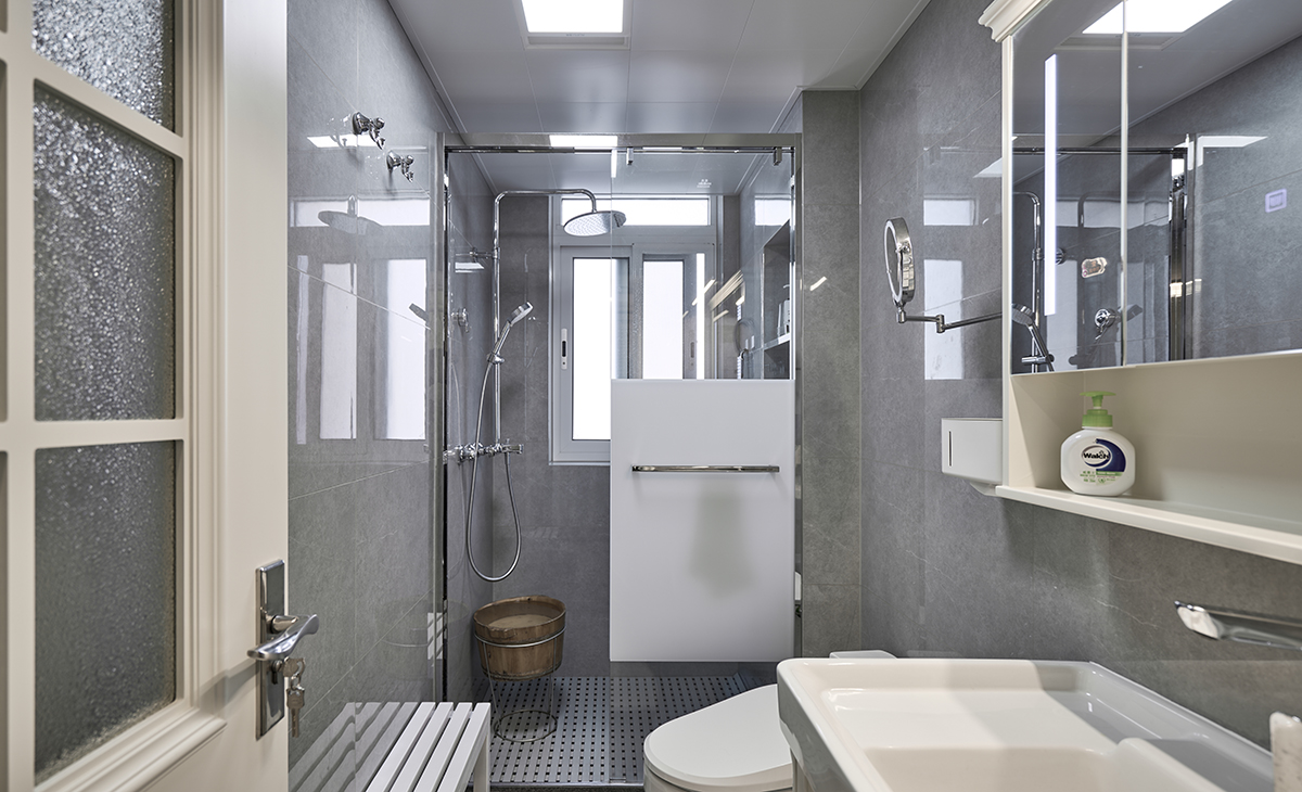 衛生間采用干濕分離的布置,淺灰色墻磚配白色浴室柜和黑色邊框長虹玻璃移門,顏色明暗有序,從深到淺,色調很豐富,掛墻臺盆柜,墻排水設計,下方又設計一個地漏,顏色協調統一。