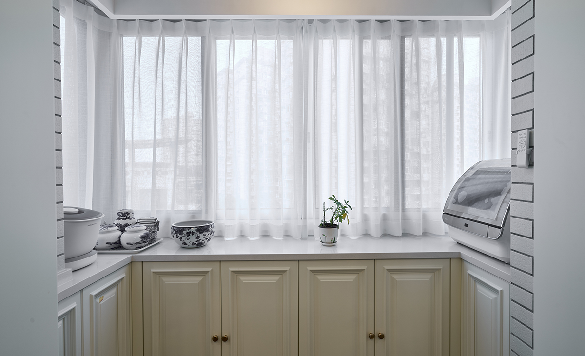 該套房子陽臺的空間利用的很完美,定制洗衣機柜,儲物空間很大,有一個小水池也能洗洗小東西,上面做一個吊柜,留一開放格放經常用的物品,使用起來很方便,把空間襯托的完美無瑕。